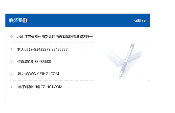 地址:常州市新北區友邦商務大廈1幢16、17層  電話:0519-85101652  傳真:0519-85112595  郵編:213022  網址:www.cz-jiayue_cn.yuchaifdj.com  郵箱:xiajifengaa@163.com